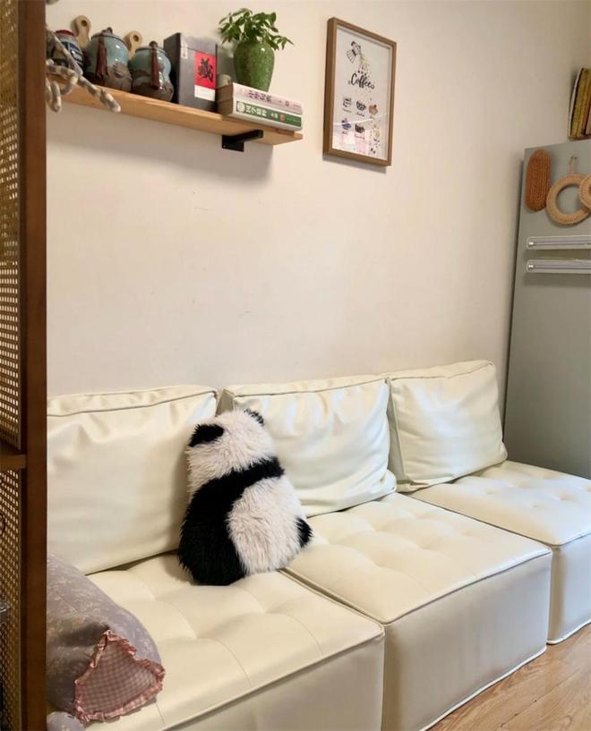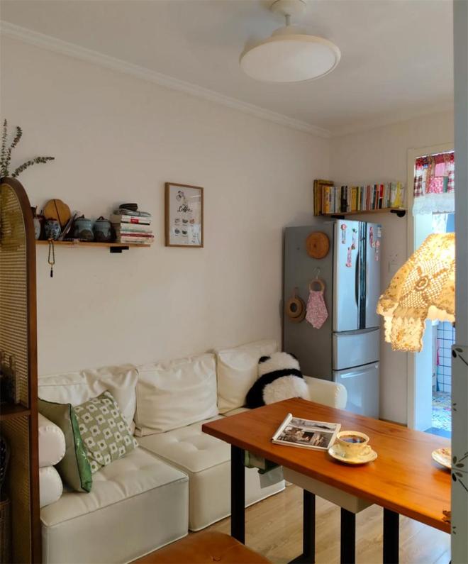 另一侧,保留了客厅的长沙发,三人位的“豆腐块”放在这里显得恰到好处,坐着既舒服又不会浪费太多空间。甚至在沙发旁边,还留出了放置一台小冰箱的位置,对于小户型的房子来说,每一寸空间都值得充分利用。