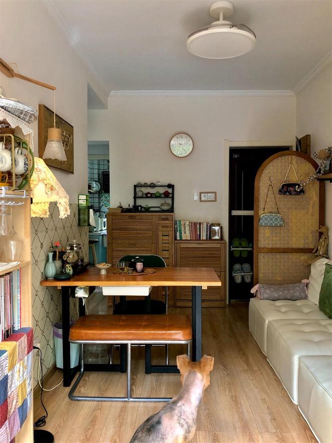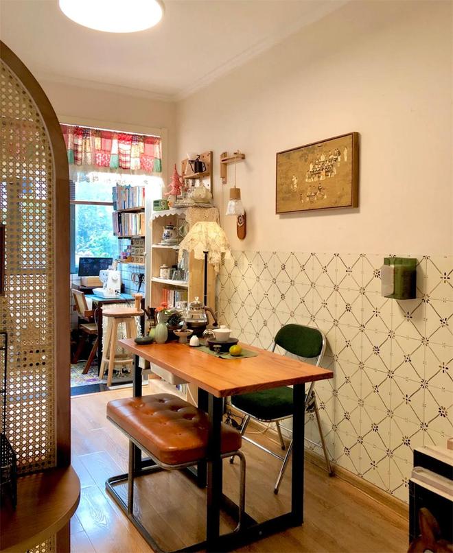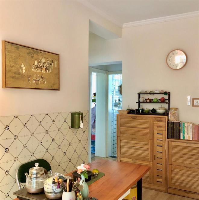 家里的客厅开间很窄,出于实用性考虑并没有做传统的客厅茶几电视柜布局,而是放上一张小餐桌,一边是折叠椅,另一边是长凳,坐下三口人刚好合适,不会觉得太过拥挤,身后的半墙花砖,则有种复古的感觉(主要还是为了方便清理)。