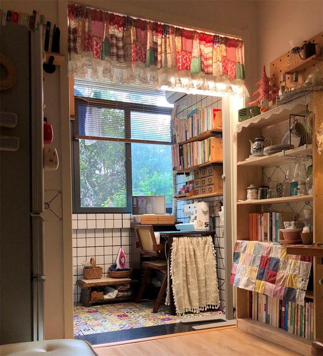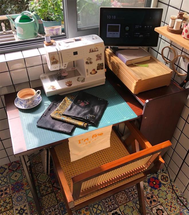 靠墙角和窗户的位置,放上一张书桌,妻子平时会在这里坐坐缝纫手工、读读书,或者居家办公,采光绝佳。