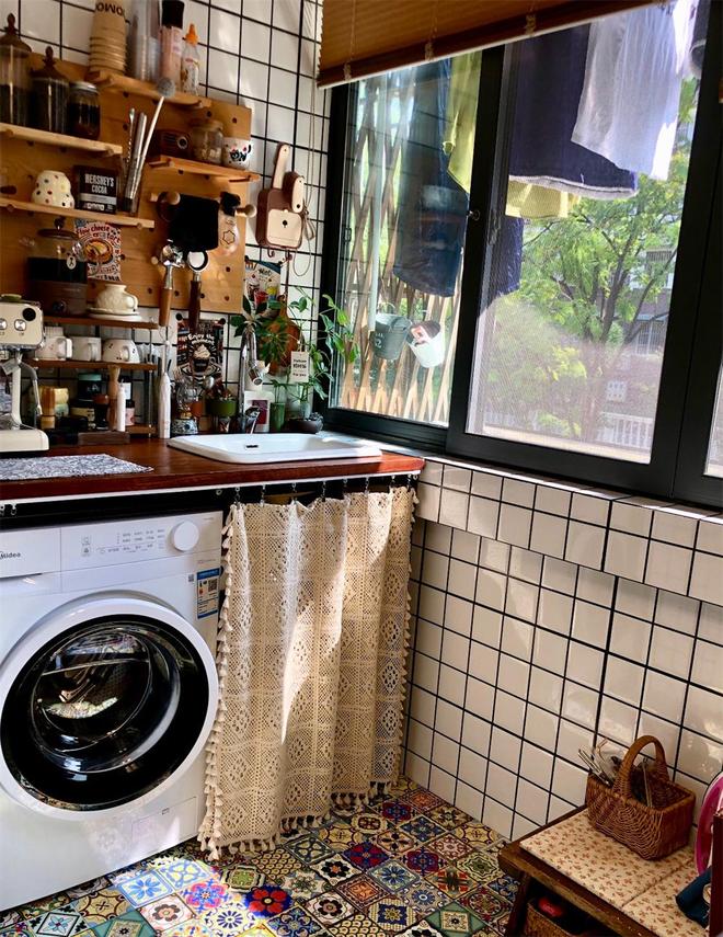 另一边就更简单了,嵌入洗衣机和水槽,当作一个小型洗衣角,衣物清洗干净后可以晾晒到屋外,不会占用太多室内空间。