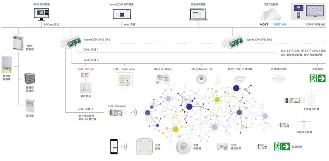 sceneCOM evo照明控制系统:支持从单空间到整栋建筑的集中监控与场景管理,可无缝集成至楼宇管理系统(BMS),实现照明与暖通、安防等子系统的协同联动;
